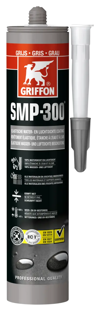 • SMP-300® kann auf beschiefertem Bitumen eingesetzt werden, allerdings wird von einer Anwendung auf unbehandeltem oder rohem Bitumen abgeraten, da es mit der Zeit zur Verfärbung oder Ablösung der Abdichtung kommen kann. • Wenn ein Fugendichtstoff in Kombination mit SMP-300® verwendet wird, empfehlen wir dringend die Verwendung eines neutralen Silikon- oder eines SMP-Dichtstoffs, z.B. Griffon S-200 oder Poly Max® Fix & Seal, da es ansonsten zu einer Verfärbung des Dichtstoffs kommen kann. • Nicht verwendbar für PE, PP und PTFE.