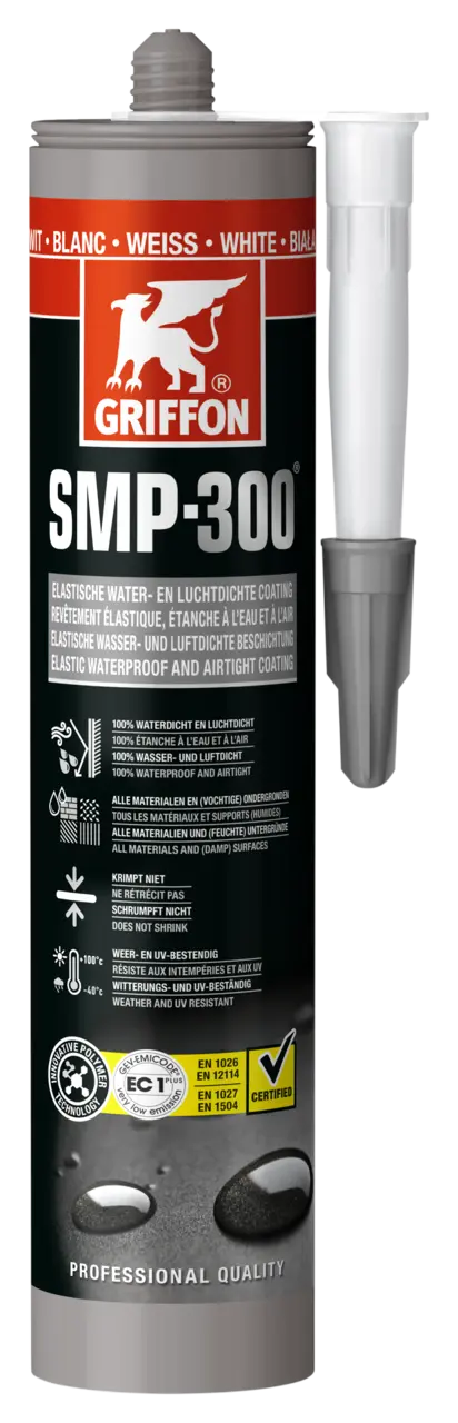 • SMP-300® kann auf beschiefertem Bitumen eingesetzt werden, allerdings wird von einer Anwendung auf unbehandeltem oder rohem Bitumen abgeraten, da es mit der Zeit zur Verfärbung oder Ablösung der Abdichtung kommen kann. • Wenn ein Fugendichtstoff in Kombination mit SMP-300® verwendet wird, empfehlen wir dringend die Verwendung eines neutralen Silikon- oder eines SMP-Dichtstoffs, z.B. Griffon S-200 oder Poly Max® Fix & Seal, da es ansonsten zu einer Verfärbung des Dichtstoffs kommen kann. • Nicht verwendbar für PE, PP und PTFE.