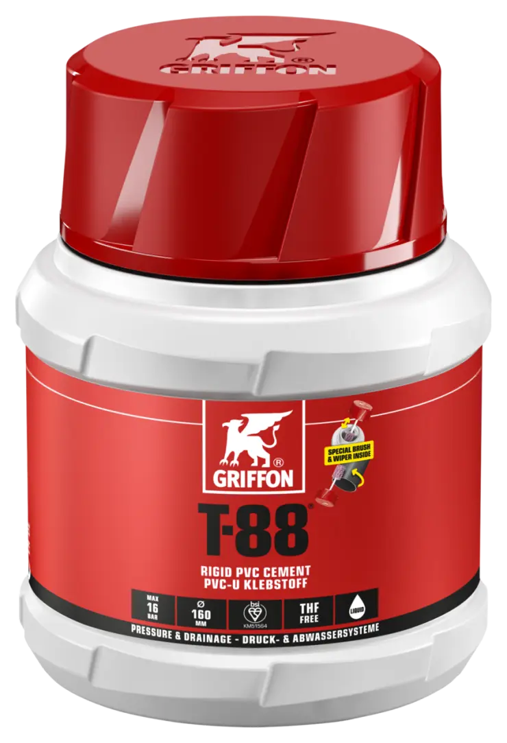 1. Rohre rechtwinklig absägen, abschrägen und entgraten. 2. Klebeflächen mit Griffon Cleaner und Cleaner Cloth reinigen. 3. Klebstoff schnell und gleichmäßig rundum (4-6x) auf beide Klebflächen auftragen (Rohrende dick, Muffe dünn). 4. Klebeverbindung sofort fügen. Überschüssigen Klebstoff entfernen. Verbindung die ersten 10 Minuten nicht mechanisch belasten. Nach Gebrauch Behälter sofort gut verschließen.