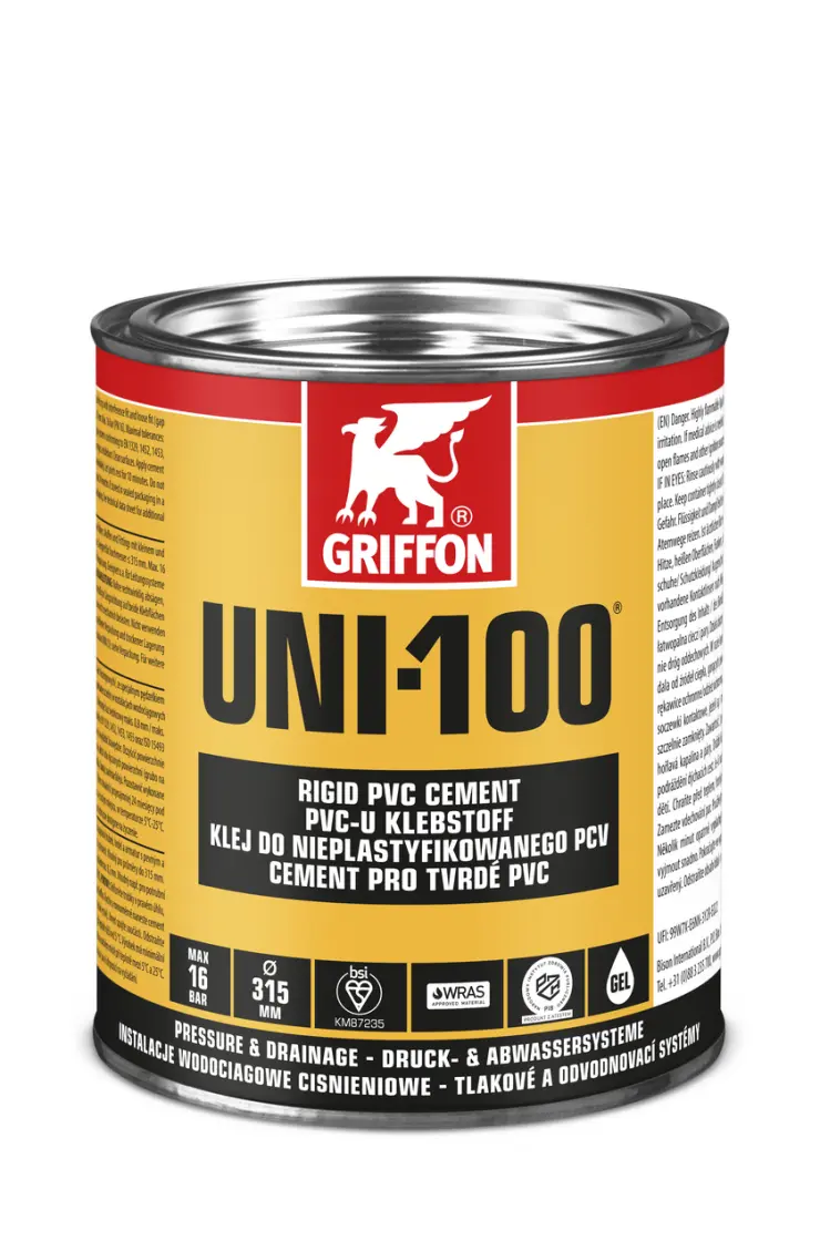 1. Rohre rechtwinklig absägen, abschrägen und entgraten. 2. Klebeflächen mit Griffon Cleaner und Cleaner Cloth reinigen. 3. Klebstoff schnell und gleichmäßig in Längsrichtung auf beide Klebflächen auftragen (Rohrende dick, Muffe dünn). 4. Klebeverbindung sofort fügen. Überschüssigen Klebstoff entfernen. Verbindung die ersten 10 Minuten nicht mechanisch belasten. Nach Gebrauch Verpackung sofort gut verschließen.