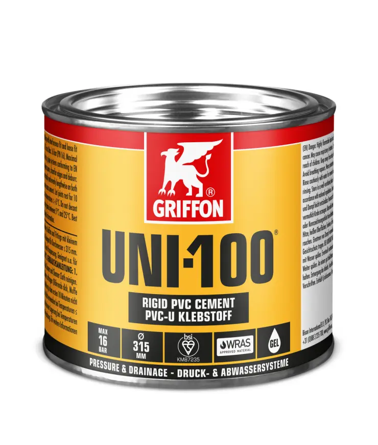 1. Rohre rechtwinklig absägen, abschrägen und entgraten. 2. Klebeflächen mit Griffon Cleaner und Cleaner Cloth reinigen. 3. Klebstoff schnell und gleichmäßig in Längsrichtung auf beide Klebflächen auftragen (Rohrende dick, Muffe dünn). 4. Klebeverbindung sofort fügen. Überschüssigen Klebstoff entfernen. Verbindung die ersten 10 Minuten nicht mechanisch belasten. Nach Gebrauch Verpackung sofort gut verschließen.