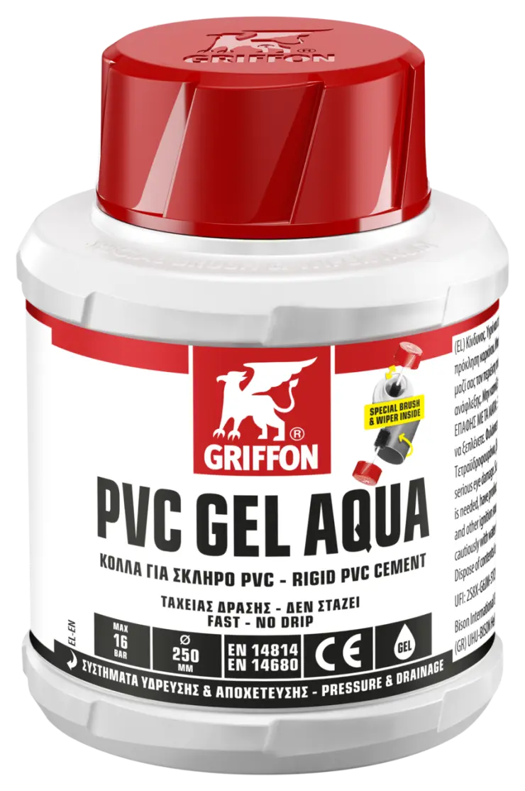 1. Λοξοτομήστε τhς σωλήνες , λειάνετε και απομακρύνετε τα γρέζια. 2. Καθαρίστε τις επιφάνειες προς συγκόλληση με το καθαριστικό Griffon Cleaner και πανί που δεν αφήνει χνούδι . 3. Εφαρμόστε την κόλλα με γρήγορες και ομοιόμορφες κινήσεις σε όλη την περιοχή (4-6x) και των δύο επιφανειών προς συγκόλληση (παχιά στρώση στο σωλήνα, λεπτό στρώση στην υποδοχή). 4. Ενώστε αμέσως. Αφαιρέστε την περίσσεια κόλλα. Μην επιβαρύνετε μηχανικά τη σύνδεση μέχρι να περάσουν τα πρώτα 10 λεπτά. Κλείστε καλά το δοχείο αμέσως μετά τη χρήση.