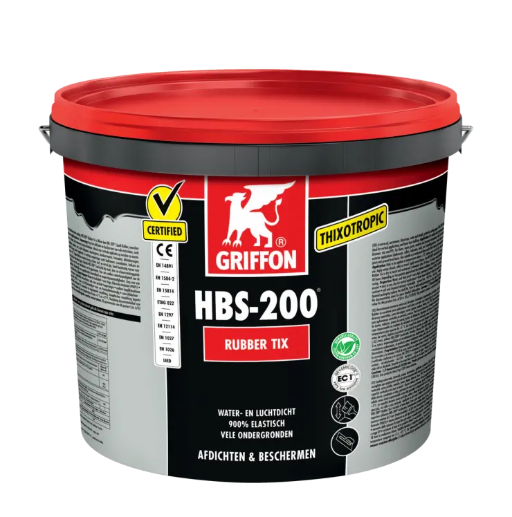 To only be used at temperatures above +5°C. Stir thoroughly by hand before use, do not use an electric mixer. After approximately 60 minutes a surface skin forms, which can be loaded with (light) rainfall after 4 hours. Completely waterproof after 24 hours. At lower temperatures and humid weather conditions, take longer drying times into account. It is strongly recommended not to spray HBS-200 Rubber Tix without wearing gloves, protective clothing, eye and face protection. If a joint sealant is used in combination with HBS-200® Liquid Rubber / Rubber Tix, we strongly recommend to use a neutral silicone sealant, for example GRIFFON S-200, to prevent discoloration of the sealant.