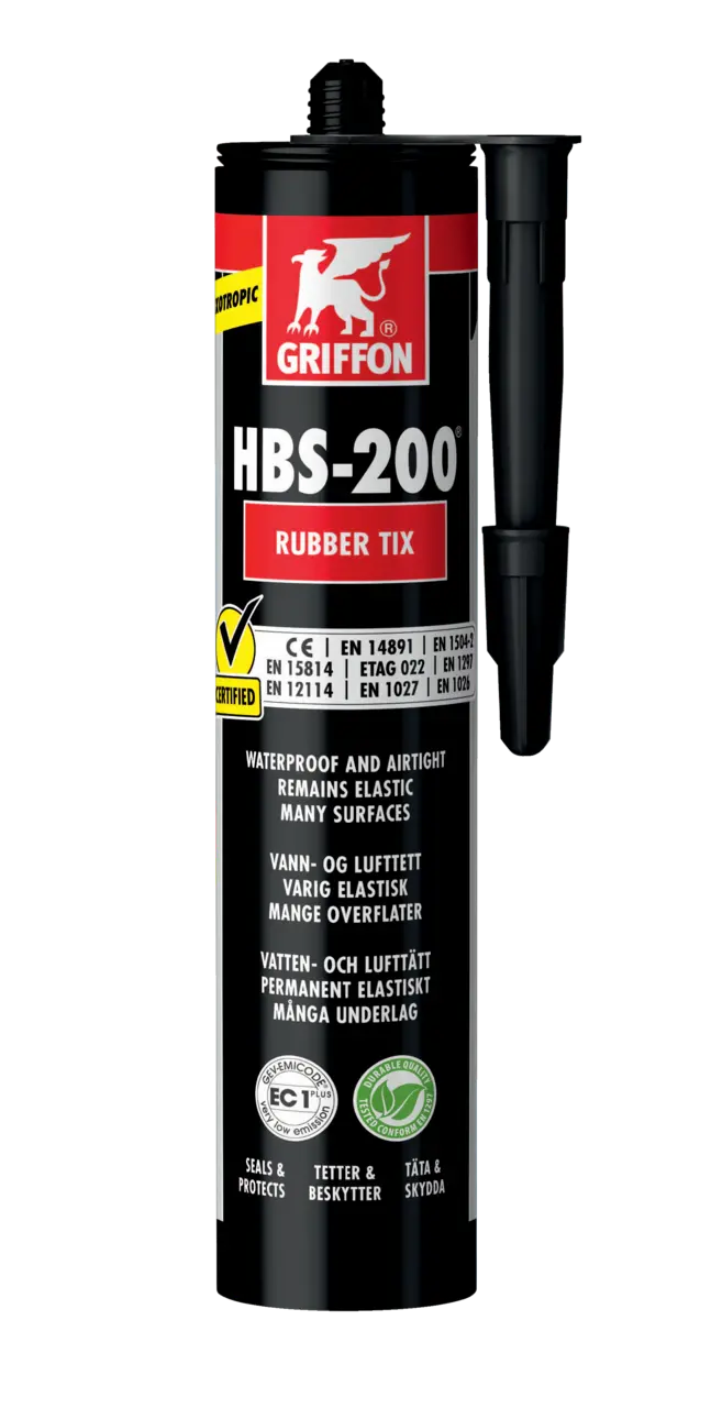 To only be used at temperatures above +5°C. After 30 to 60 minutes a surface skin forms, which can be loaded with (light) rainfall after 2 hours. Completely waterproof after 24 hours. Fully cured after 48 hours depending on the quantity applied and the ambient conditions. If a joint sealant is used in combination with HBS-200® Liquid Rubber / Rubber Tix, we strongly recommend to use a neutral silicone sealant, for example GRIFFON S-200, to prevent discoloration of the sealant.