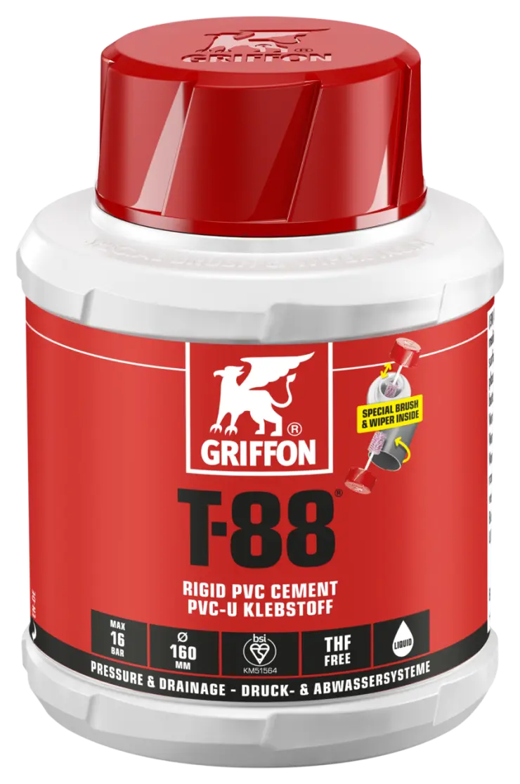 For joining pipes, sockets and fittings with interference fit in pressure and drainage systems. With special round pipe brush and wiper for a quick, clean, and optimal application. Suitable for diameters ≤ 160 mm (pressure ≤ 90 mm). Max. 16 bar (PN 16). Maximal tolerances: 0.3 mm diametrical clearance / 0.2 mm press fit. Suitable for e.g. pipe systems conforming to EN 1329, 1452, 1453 and 1455.