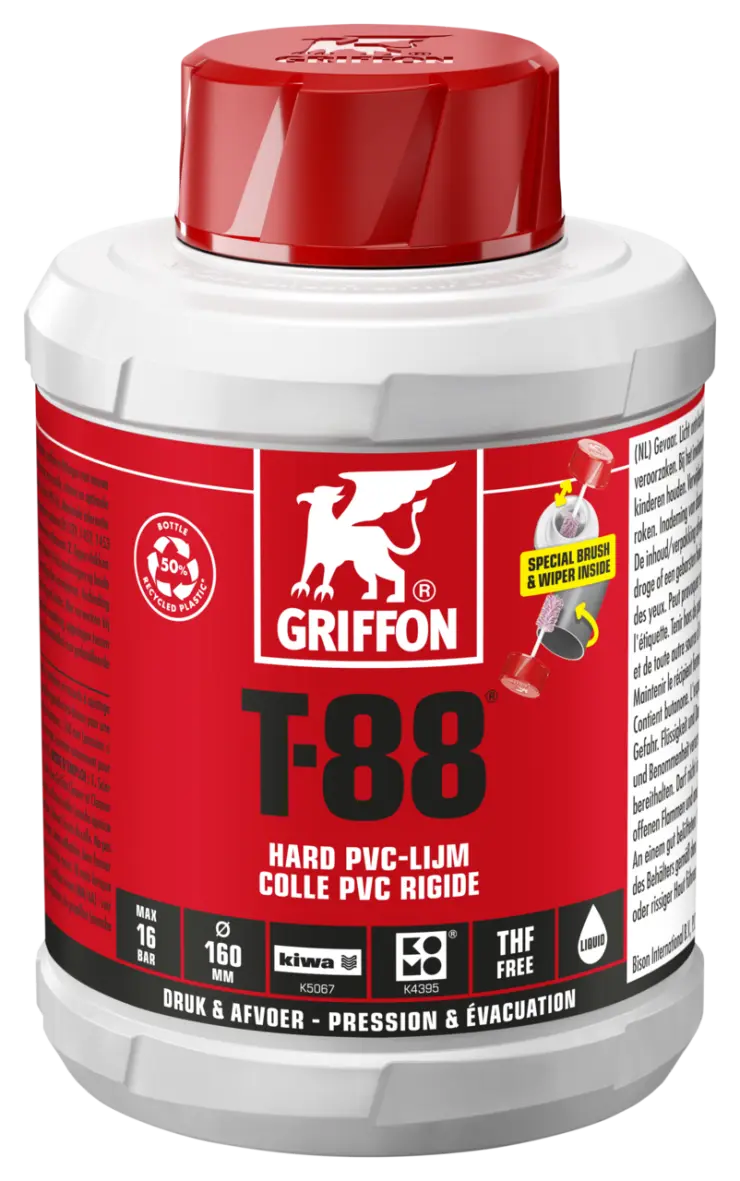 For joining pipes, sockets and fittings with interference fit in pressure and drainage systems. With special round pipe brush and wiper for a quick, clean, and optimal application. Suitable for diameters ≤ 160 mm (pressure ≤ 90 mm). Max. 16 bar (PN 16). Maximal tolerances: 0.3 mm diametrical clearance / 0.2 mm press fit. Suitable for e.g. pipe systems conforming to EN 1329, 1452, 1453 and 1455.