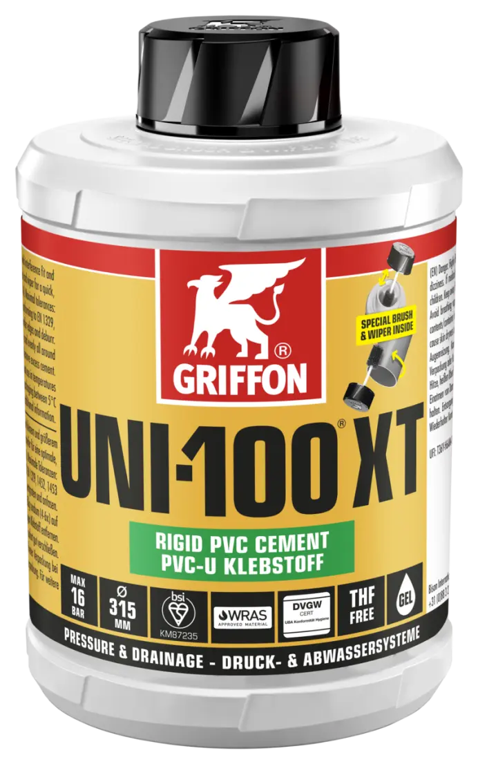 1. Cut pipes square, chamfer edges and deburr. 2. Clean surfaces with Griffon Cleaner and Cleaner Cloth. 3. Apply adhesive rapidly and evenly lengthways on both surfaces (pipe thickly, socket thinly). 4. Assemble joint immediately. Remove excess adhesive. Do not load the joint mechanically for the first 10 minutes. Close packaging immediately after use.