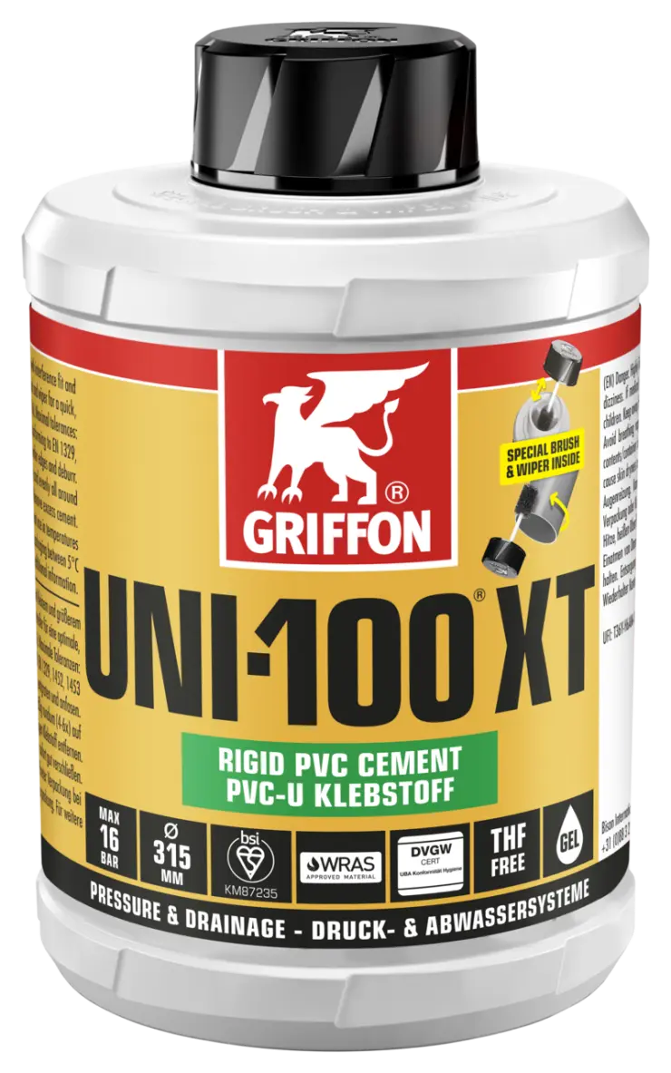 1. Cut pipes square, chamfer edges and deburr. 2. Clean surfaces with Griffon Cleaner and Cleaner Cloth. 3. Apply adhesive rapidly and evenly all around (4-6x) on both surfaces (pipe thickly, socket thinly). 4. Assemble joint immediately. Remove excess adhesive. Do not load the joint mechanically for the first 10 minutes. Close packaging immediately after use.