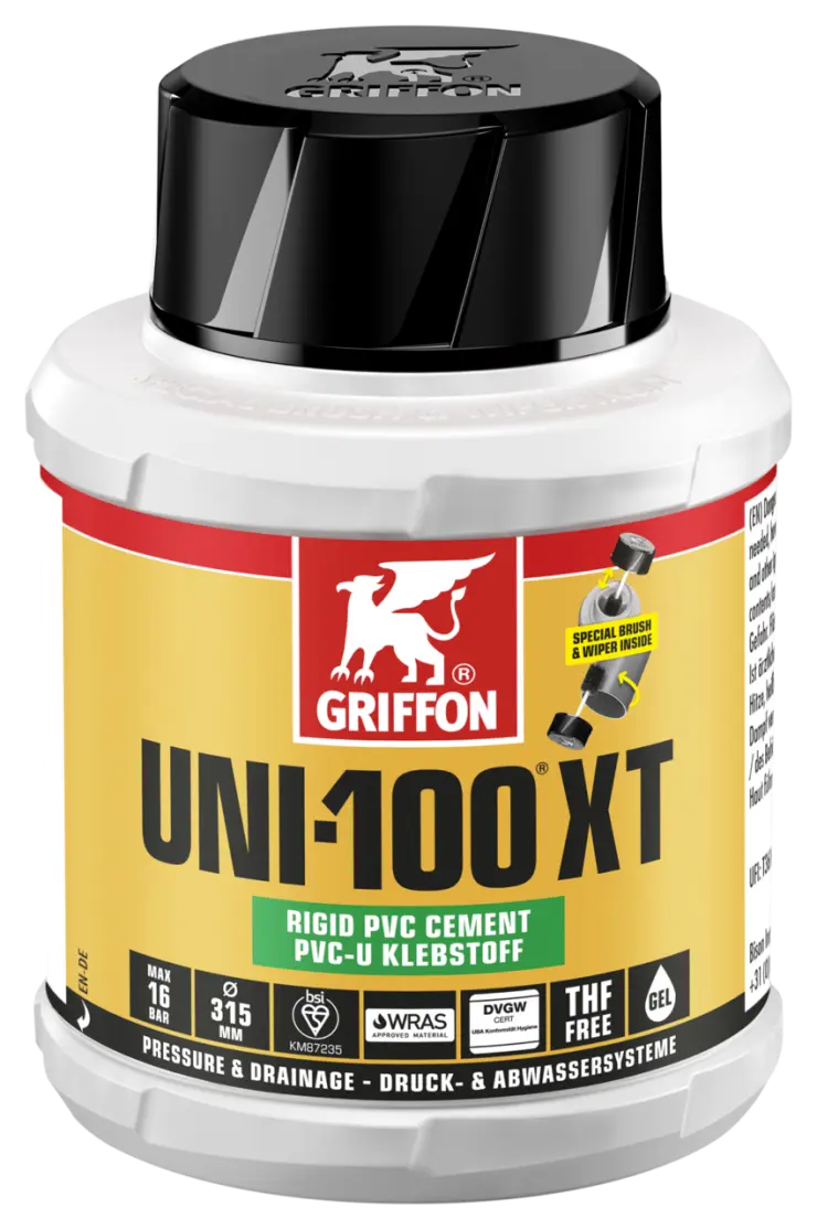 1. Cut pipes square, chamfer edges and deburr. 2. Clean surfaces with Griffon Cleaner and Cleaner Cloth. 3. Apply adhesive rapidly and evenly all around (4-6x) on both surfaces (pipe thickly, socket thinly). 4. Assemble joint immediately. Remove excess adhesive. Do not load the joint mechanically for the first 10 minutes. Close packaging immediately after use.