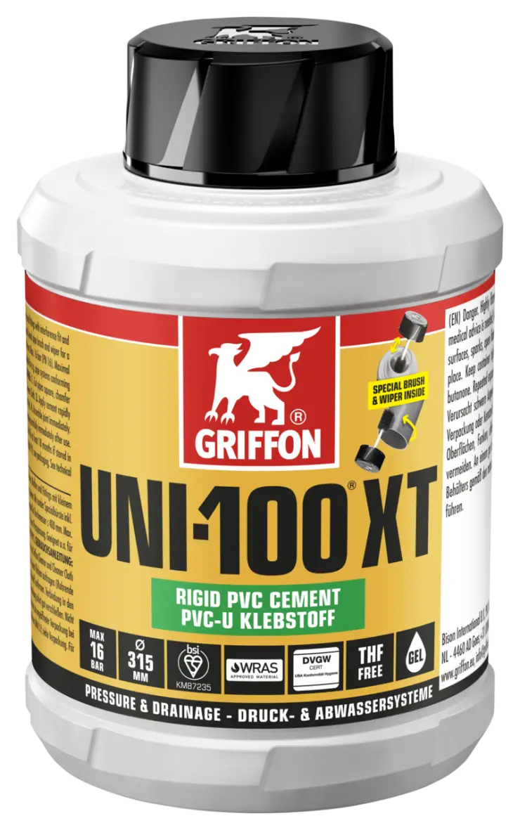 1. Cut pipes square, chamfer edges and deburr. 2. Clean surfaces with Griffon Cleaner and Cleaner Cloth. 3. Apply adhesive rapidly and evenly all around (4-6x) on both surfaces (pipe thickly, socket thinly). 4. Assemble joint immediately. Remove excess adhesive. Do not load the joint mechanically for the first 10 minutes. Close packaging immediately after use.