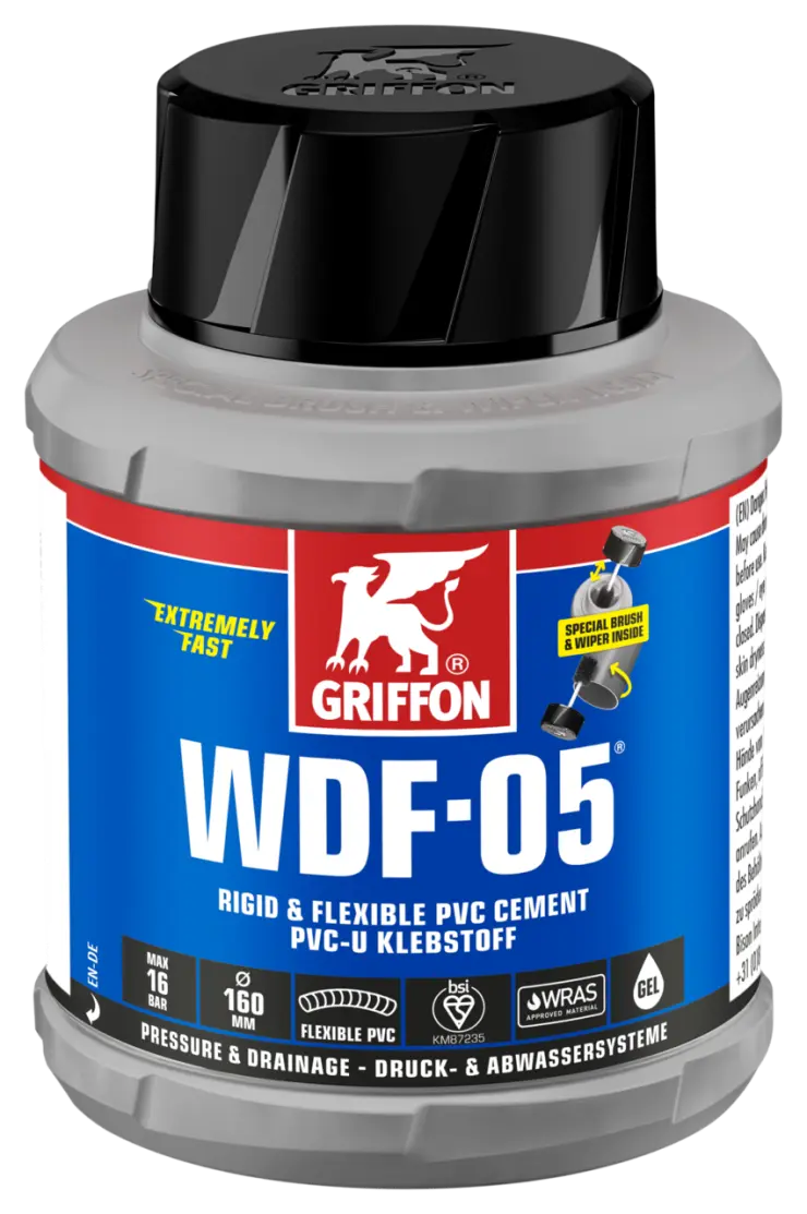 1. Cut pipes square, chamfer edges and deburr. 2. Clean surfaces with Griffon Cleaner and Cleaner Cloth. 3. Apply adhesive rapidly and evenly all around (4-6x) on both surfaces (pipe thickly, socket thinly). 4. Assemble joint immediately. Remove excess adhesive. Do not load the joint mechanically for the first 10 minutes. Close packaging immediately after use.