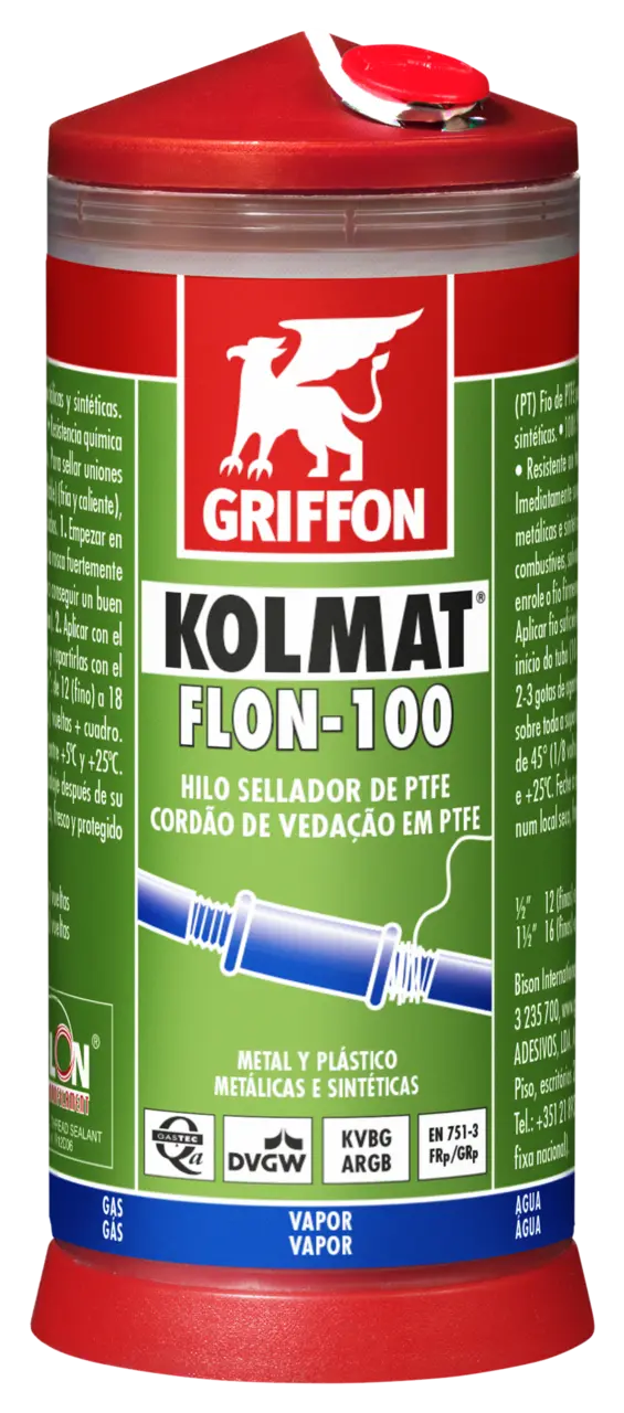 Para el sellado de conexiones roscadas cónicas o cilíndricas de metal o material sintético. Adecuado para agua (potable) fría y caliente, vapor, gas, GLP, combustibles, disolventes, aire (comprimido), oxígeno, así como ácidos y bases. Aplicable en conexiones roscadas de, por ejemplo: cobre, latón, acero (galvanizado), acero inoxidable, cromo, zinc, PVC, CPVC y ABS. Prestaciones: Gas: hasta 20 bar de presión a temperaturas de –20 °C a +125 °C. Agua (vapor): hasta 16 bar a +95 °C, hasta 7 bar a +130 °C.