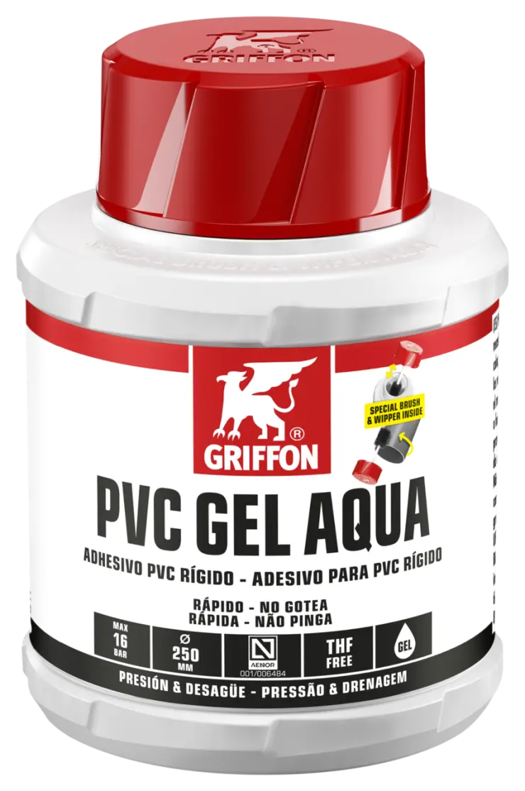 1. Cortar los tubos en ángulo recto, biselarlos y desbarbarlos. 2. Limpiar las superficies antes de pegar con Griffon Cleaner y Cleaner Cloth. 3. Aplicar el adhesivo de forma rápida y uniforme en círculo (4-6 repeticiones) sobre ambas superficies (capa gruesa sobre el tubo, capa fina sobre el manguito). 4. Montar inmediatamente la unión. Eliminar el exceso de adhesivo. No someter la unión a carga mecánica durante los primeros 10 minutos. Cerrar bien el envase inmediatamente después de uso.