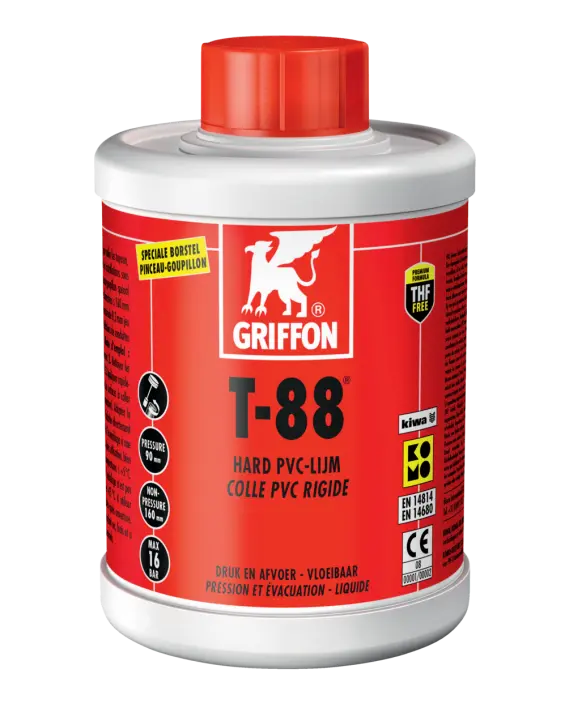 1. Scier les tuyaux à l’équerre, chanfreiner et ébavurer. 2. Nettoyer les surfaces à coller avec Griffon Cleaner et Cleaner Cloth. 3. Appliquer rapidement et uniformément la colle tout autour (4-6x) des deux surfaces à coller (couche épaisse sur le tuyau, couche fine dans le manchon). 4. Emboîter directement le manchon. Enlever l’excès de colle. Ne pas soumettre l’assemblage à une charge mécanique pendant les 10 premières minutes. Après utilisation, bien fermer l’emballage.