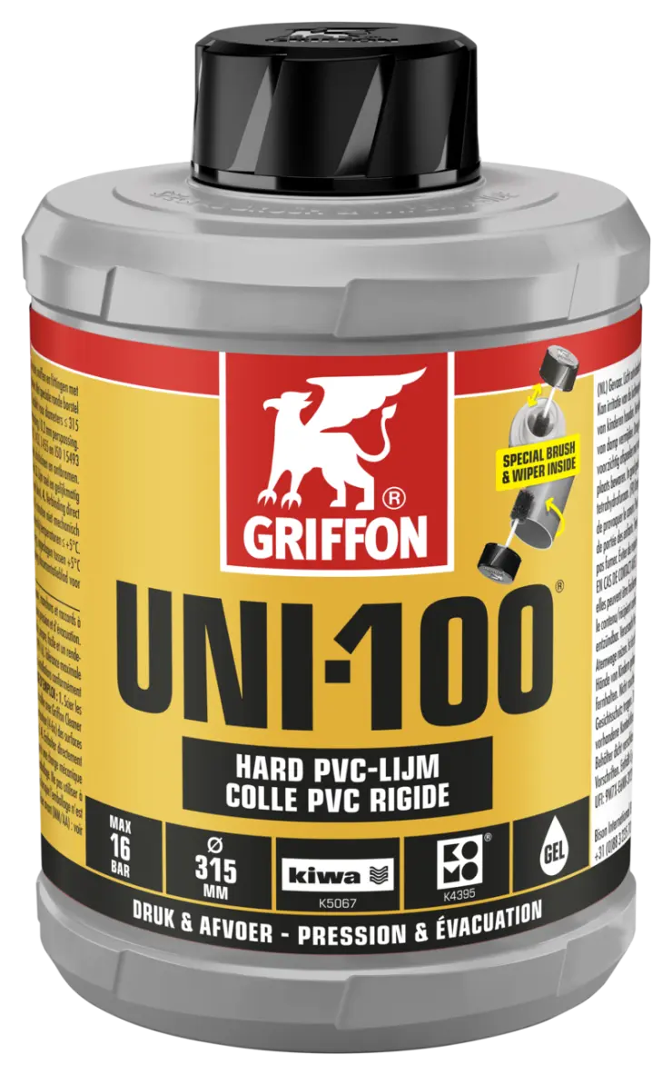 Pour coller les tuyaux, manchons et raccords à ajustage serré et plus large (garnit les joints) dans des installations sous pression et d’évacuation. Avec pinceau-goupillon spécial pour une utilisation rapide et facile. Convient pour des diamètres ≤ 315 mm. Max. 16 bar (PN 16). Tolérance maximale 0,8 mm jeu / 0,2 mm serrage. Convient notamment pour toutes les installations conformément aux normes EN 1329, 1452, 1453, 1455 et ISO 15493 (PVC).