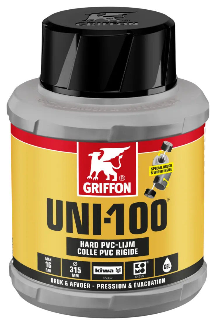 Pour coller les tuyaux, manchons et raccords à ajustage serré et plus large (garnit les joints) dans des installations sous pression et d’évacuation. Avec pinceau-goupillon spécial pour une utilisation rapide et facile. Convient pour des diamètres ≤ 315 mm. Max. 16 bar (PN 16). Tolérance maximale 0,8 mm jeu / 0,2 mm serrage. Convient notamment pour toutes les installations conformément aux normes EN 1329, 1452, 1453, 1455 et ISO 15493 (PVC).