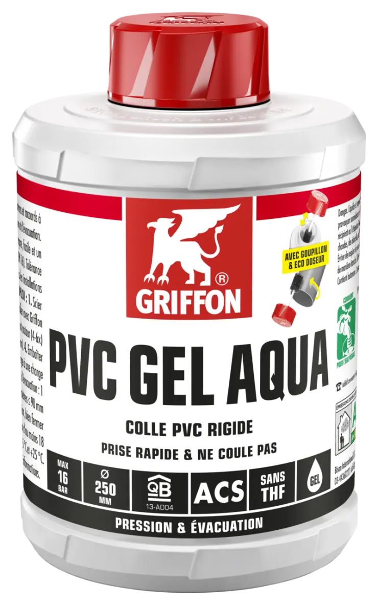1. Scier les tuyaux à l’équerre, chanfreiner et ébavurer. 2. Nettoyer les surfaces à coller avec Griffon Cleaner et Cleaner Cloth. 3. Appliquer rapidement et uniformément la colle tout autour (4-6x) des deux surfaces à coller (couche épaisse sur le tuyau, couche fine dans le manchon). 4. Emboîter directement le manchon. Enlever l’excès de colle. Ne pas soumettre l’assemblage à une charge mécanique pendant les 10 premières minutes. Après utilisation, bien fermer l’emballage.