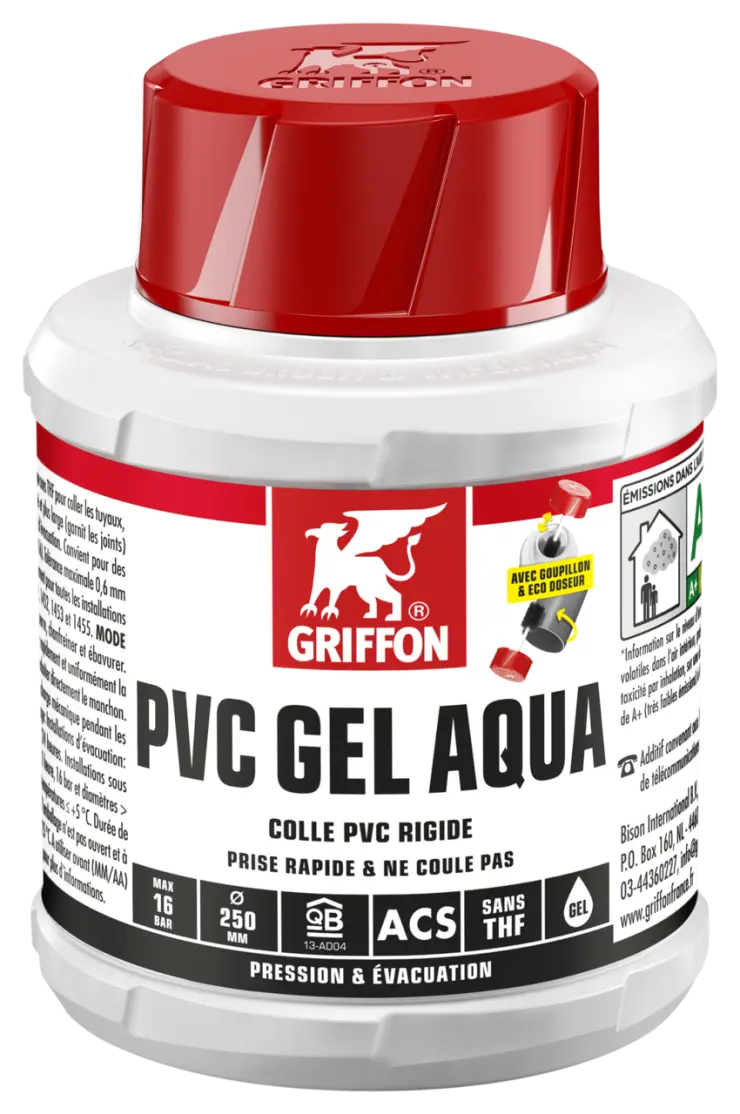 1. Scier les tuyaux à l’équerre, chanfreiner et ébavurer. 2. Nettoyer les surfaces à coller avec Griffon Cleaner et Cleaner Cloth. 3. Appliquer rapidement et uniformément la colle tout autour (4-6x) des deux surfaces à coller (couche épaisse sur le tuyau, couche fine dans le manchon). 4. Emboîter directement le manchon. Enlever l’excès de colle. Ne pas soumettre l’assemblage à une charge mécanique pendant les 10 premières minutes. Après utilisation, bien fermer l’emballage.