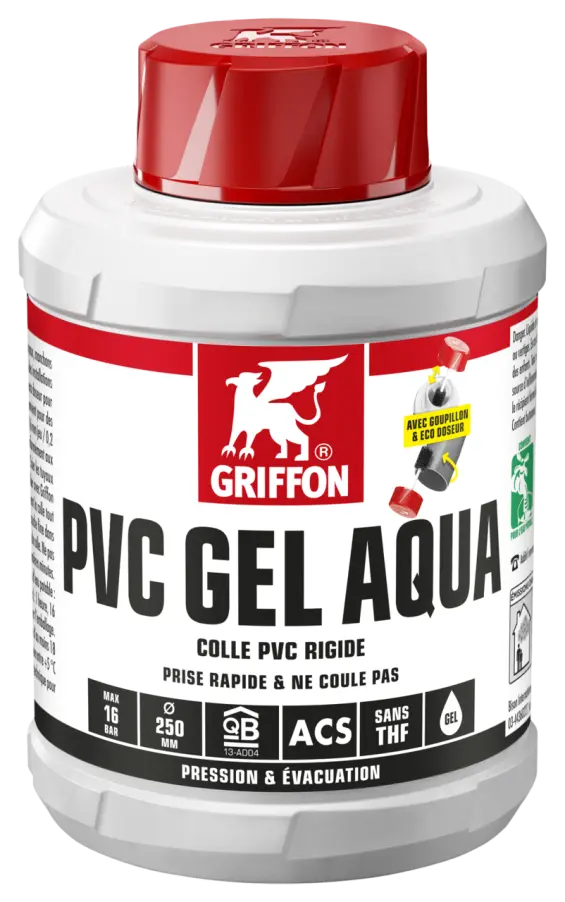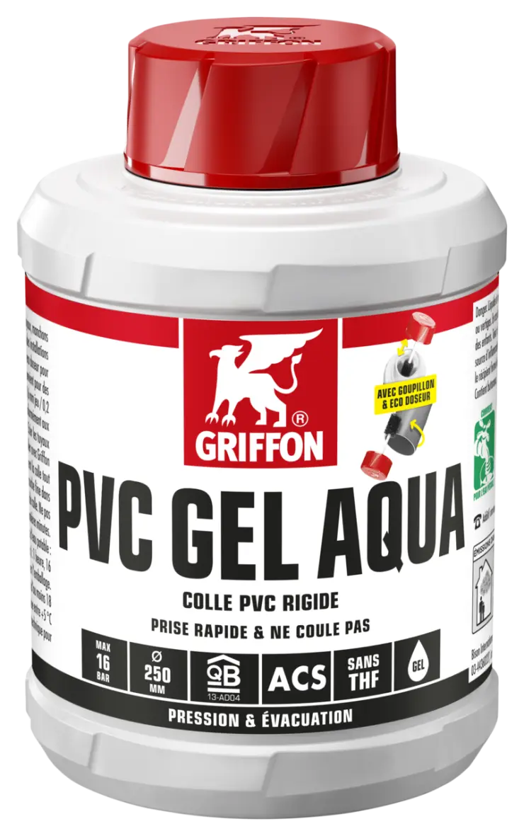 1. Scier les tuyaux à l’équerre, chanfreiner et ébavurer. 2. Nettoyer les surfaces à coller avec Griffon Cleaner et Cleaner Cloth. 3. Appliquer rapidement et uniformément la colle tout autour (4-6x) des deux surfaces à coller (couche épaisse sur le tuyau, couche fine dans le manchon). 4. Emboîter directement le manchon. Enlever l’excès de colle. Ne pas soumettre l’assemblage à une charge mécanique pendant les 10 premières minutes. Après utilisation, bien fermer l’emballage.