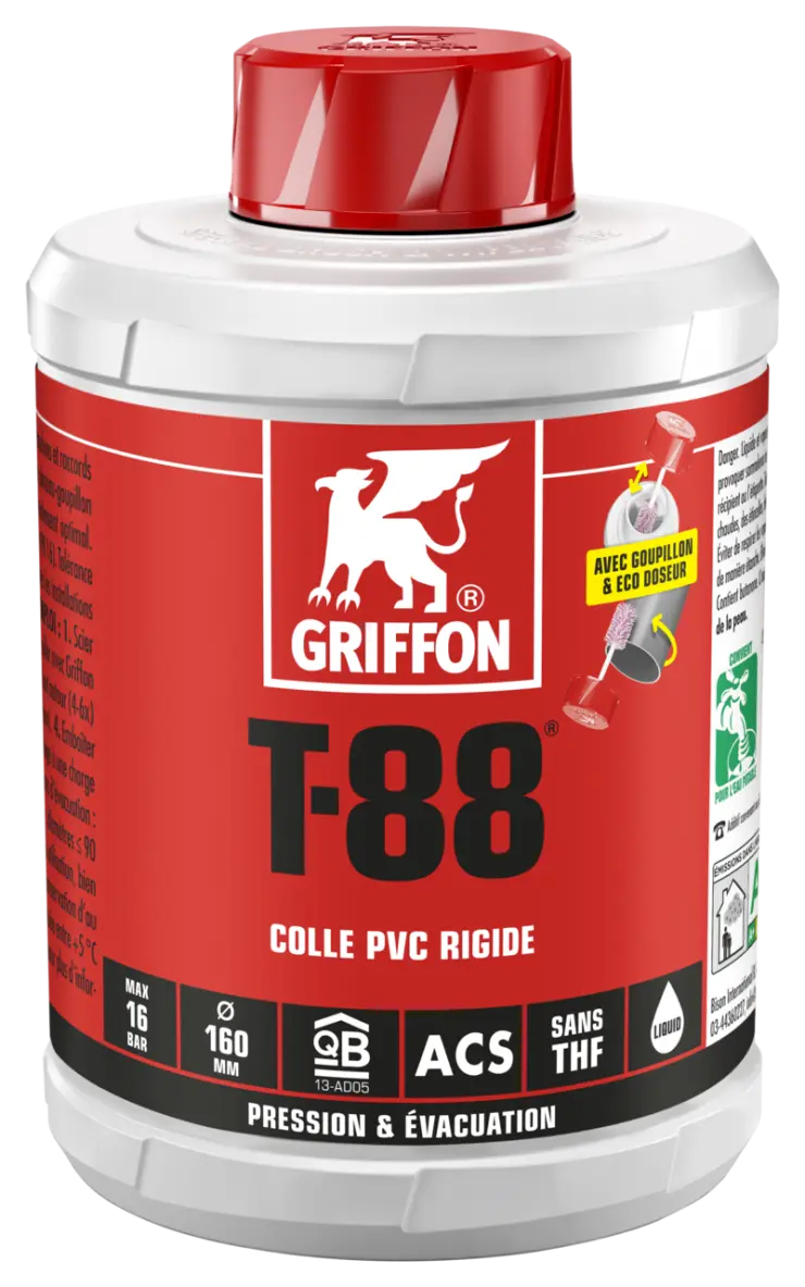 1. Scier les tuyaux à l’équerre, chanfreiner et ébavurer. 2. Nettoyer les surfaces à coller avec Griffon Cleaner et Cleaner Cloth. 3. Appliquer rapidement et uniformément la colle tout autour (4-6x) des deux surfaces à coller (couche épaisse sur le tuyau, couche fine dans le manchon). 4. Emboîter directement le manchon. Enlever l’excès de colle. Ne pas soumettre l’assemblage à une charge mécanique pendant les 10 premières minutes. Après utilisation, bien fermer l’emballage.