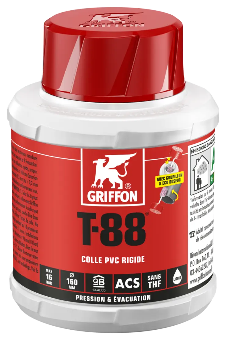 1. Scier les tuyaux à l’équerre, chanfreiner et ébavurer. 2. Nettoyer les surfaces à coller avec Griffon Cleaner et Cleaner Cloth. 3. Appliquer rapidement et uniformément la colle tout autour (4-6x) des deux surfaces à coller (couche épaisse sur le tuyau, couche fine dans le manchon). 4. Emboîter directement le manchon. Enlever l’excès de colle. Ne pas soumettre l’assemblage à une charge mécanique pendant les 10 premières minutes. Après utilisation, bien fermer l’emballage.