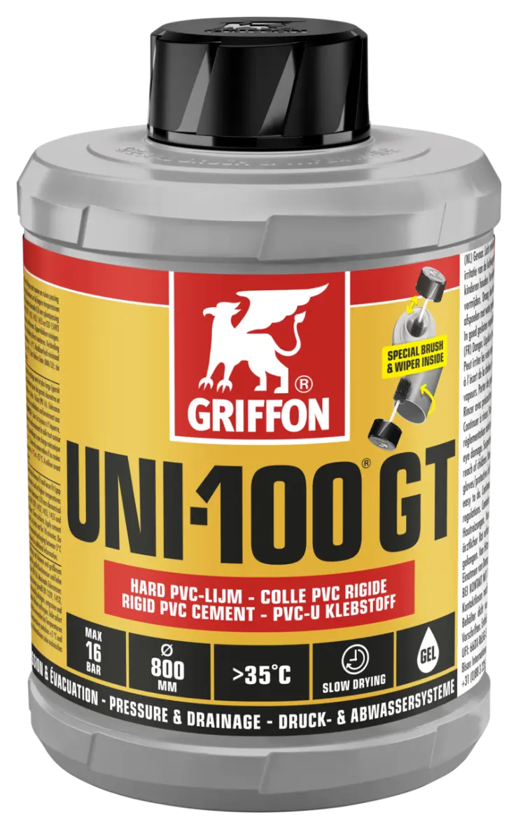 Pour coller les tuyaux, manchons et raccords à ajustage serré et plus large (garnit les joints) dans des installations sous pression et d’évacuation. Avec pinceau-goupillon spécial pour une utilisation rapide et facile. Convient idéalement pour des grands diamètres et à des températures élevées (>35 °C). Convient pour des diamètres ≤ 800 mm. Max. 16 bar (PN 16). Tolérance maximale 0,8 mm jeu / 0,2 mm serrage. Convient notamment pour toutes les installations conformément aux normes EN 1329, 1452, 1453, 1455 et ISO 15493 (PVC).