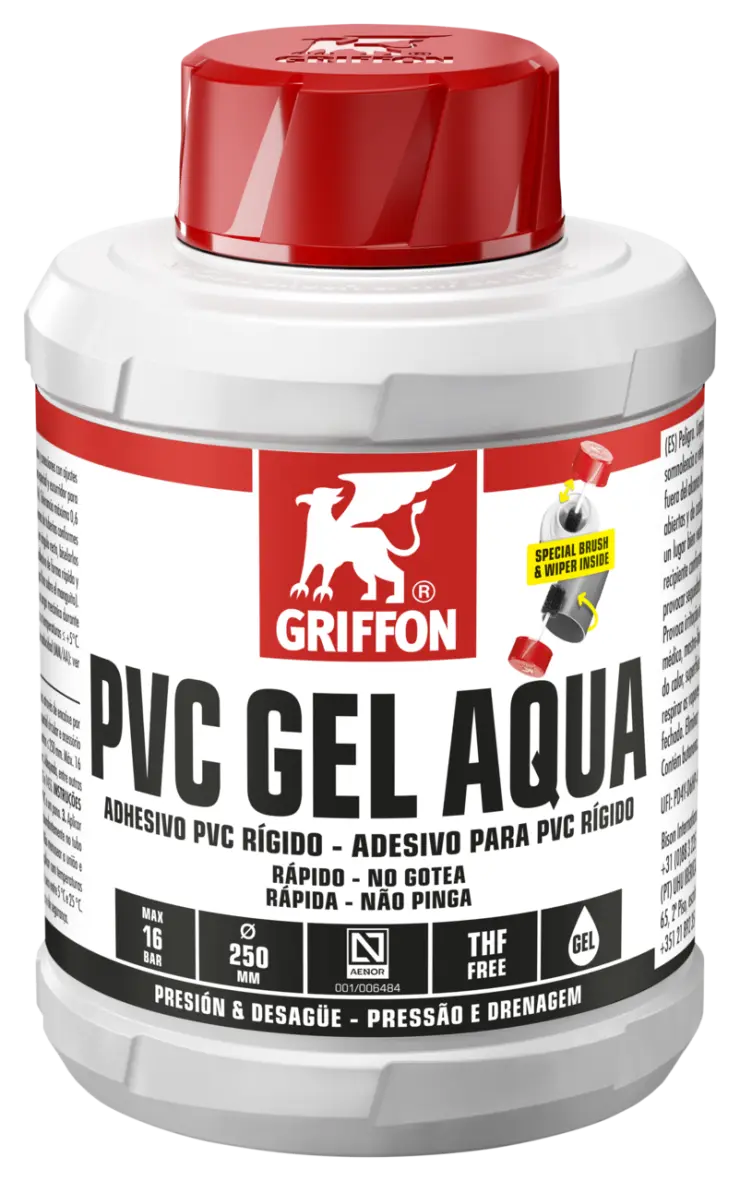 1. Tagliare i tubi perpendicolarmente, smussare i bordi e rimovere le sbavature. 2. Pulire le superfici da incollare con Griffon Cleaner e un panno privo di lanugine. 3. Applicare l’adesivo rapidamente e uniformemente su entrambe le superfici (4-6 volte) da incollare (strato spesso sul tubo, sottile sul manicotto). 4. Unire immediatamente le parti da incollare. Rimuovere l’eccesso di adesivo. Non caricare meccanicamente le parti assemblate per i primi 10 minuti. Chiudere immediatamente il contenitore dopo l’utilizzo.
