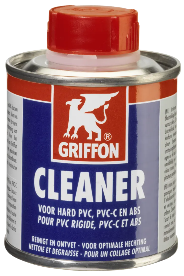 Voor het reinigen en ontvetten van buizen, moffen en fittingen van (hard) PVC, PVC-C en ABS. Tevens geschikt voor het verwijderen van niet uitgeharde lijmresten en het reinigen van kwasten en gereedschap. Gebruiken in combinatie met Griffon Cleaner Cloth.