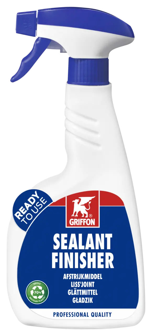 Draai de spuitdop een kwartslag. Spuit de Sealant Finisher binnen 10 minuten na het aanbrengen van de kit vanaf een afstand van ongeveer 30 cm op de kitvoeg. Bevochtig de platte kant van het GRIFFON Sealant Finishing Tool of een vinger met de Sealant Finisher en strijk de voeg glad. Dankzij de Sealant Finisher hecht de kit niet aan de Sealant Finishing Tool of ander afwerkingsgereedschap, waardoor het gladstrijken snel en gemakkelijk gaat. Laat de kitvoeg uitharden volgens de instructies van de kit. Sluit na gebruik de spuit af door de dop een kwartslag te draaien.