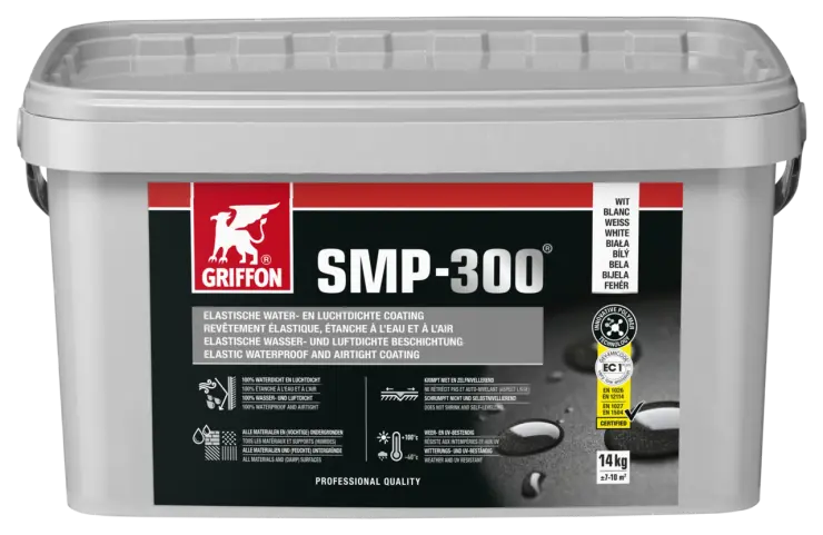 Open blik en breng een eerste laag aan met een kwast. Aanbrengen in 1 (Luchtdichte Constructies) of 2 (Waterdicht maken) lagen. Breng een eerste laag aan op het oppervlak met een kwast of roller. Gebruik GeoTextile van GRIFFON voor naad-, scheur- en scheuroverbruggende toepassingen. Druk het GeoTextile in de natte laag tot deze volledig verzadigd is met de coating. Breng een tweede laag SMP-300® aan binnen 1 uur (of in ieder geval voordat huidvorming optreedt) op de GeoTextile, of na volledige uitharding van de eerste laag (ongeveer 6 - 8 uur*). Strooi desgewenst leischilfers in de nog natte laag om een esthetisch geheel van het gehele dak te verkrijgen. *Coating hardt uit door de vochtigheid en het vocht in de ondergrond.