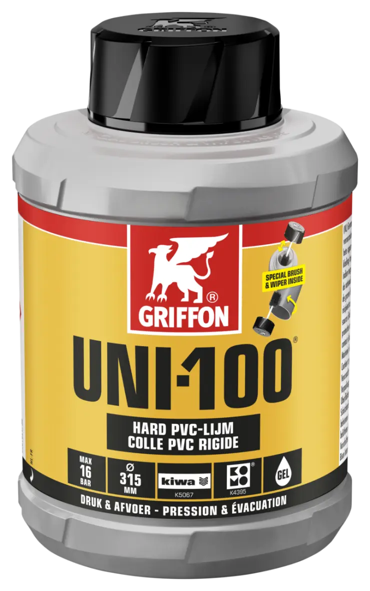 Voor het verlijmen van buizen, moffen en fittingen met nauwe en ruime passing (spleetvullend) in druk- en afvoersystemen. Met speciale borstel voor snelle en eenvoudige verwerking. Geschikt voor diameters ≤ 315 mm. Max. 16 bar (PN 16). Maximale tolerantie 0,8 mm spleetpassing / 0,2 mm perspassing. Geschikt voor o.a. leidingsystemen conform EN 1329, 1452, 1453, 1455 en ISO 15493 (PVC).