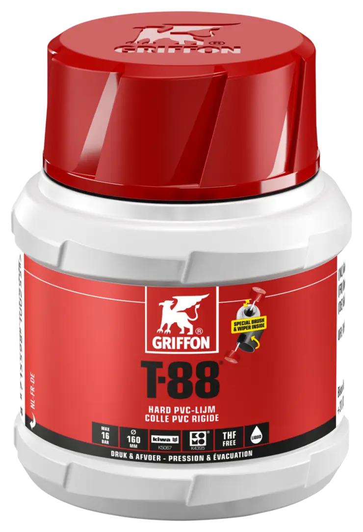 1. Buizen haaks afzagen, afschuinen en ontbramen. 2. Lijmoppervlakken reinigen met Griffon Cleaner en Cleaner Cloth. 3. Lijm snel en gelijkmatig rondom (4-6x) aanbrengen op beide lijmvlakken (buis dik, mof dun). 4. Verbinding direct monteren. Overtollige lijm verwijderen. Verbinding eerste 10 minuten niet mechanisch belasten. Na gebruik verpakking direct goed sluiten.
