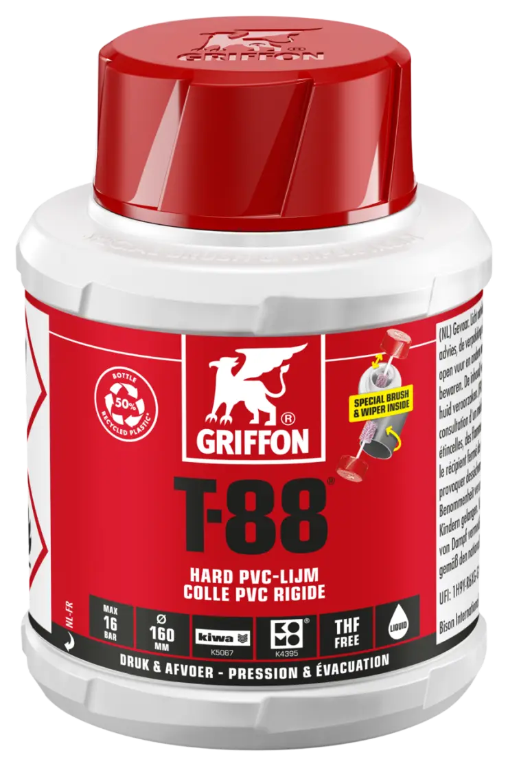 1. Buizen haaks afzagen, afschuinen en ontbramen. 2. Lijmoppervlakken reinigen met Griffon Cleaner en Cleaner Cloth. 3. Lijm snel en gelijkmatig rondom (4-6x) aanbrengen op beide lijmvlakken (buis dik, mof dun). 4. Verbinding direct monteren. Overtollige lijm verwijderen. Verbinding eerste 10 minuten niet mechanisch belasten. Na gebruik verpakking direct goed sluiten.