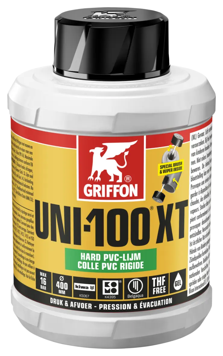 Voor het verlijmen van buizen, moffen en fittingen met nauwe en ruime passing (spleetvullend) in druk- en afvoersystemen. Met speciale borstel voor snelle en eenvoudige verwerking. Geschikt voor diameters ≤ 400 mm. Max. 16 bar (PN 16). Maximale tolerantie 0,6 mm spleetpassing / 0,2 mm perspassing. Geschikt voor o.a. leidingsystemen conform EN 1329, 1452, 1453, 1455 en ISO 15493 (PVC).