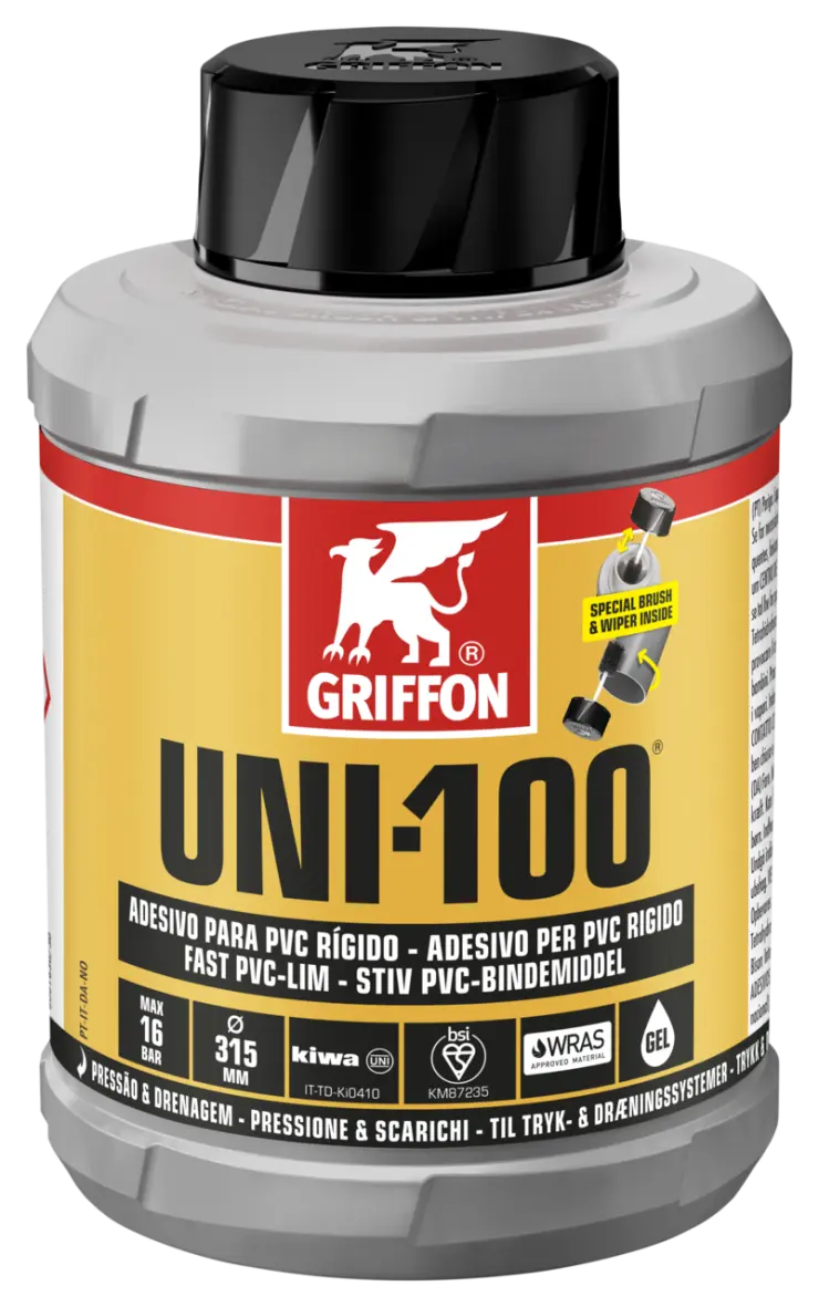 Para unir tubos, acessórios e uniões através de encaixe por pressão e folga (enchimento de folgas) em sistemas de pressão e drenagem. Fornecida com escovilhão para fácil e rápida aplicação. Adequada para diâmetros de ≤ 315 mm. Máx. 16 bar (PN 16). Tolerâncias máximas: folga diametral de 0,8 mm / encaixe por pressão de 0,2 mm. Adequada, entre outras aplicações, para sistemas de tubagens em conformidade com EN 1329, 1452, 1453, 1455 e ISO 15493 (PVC).